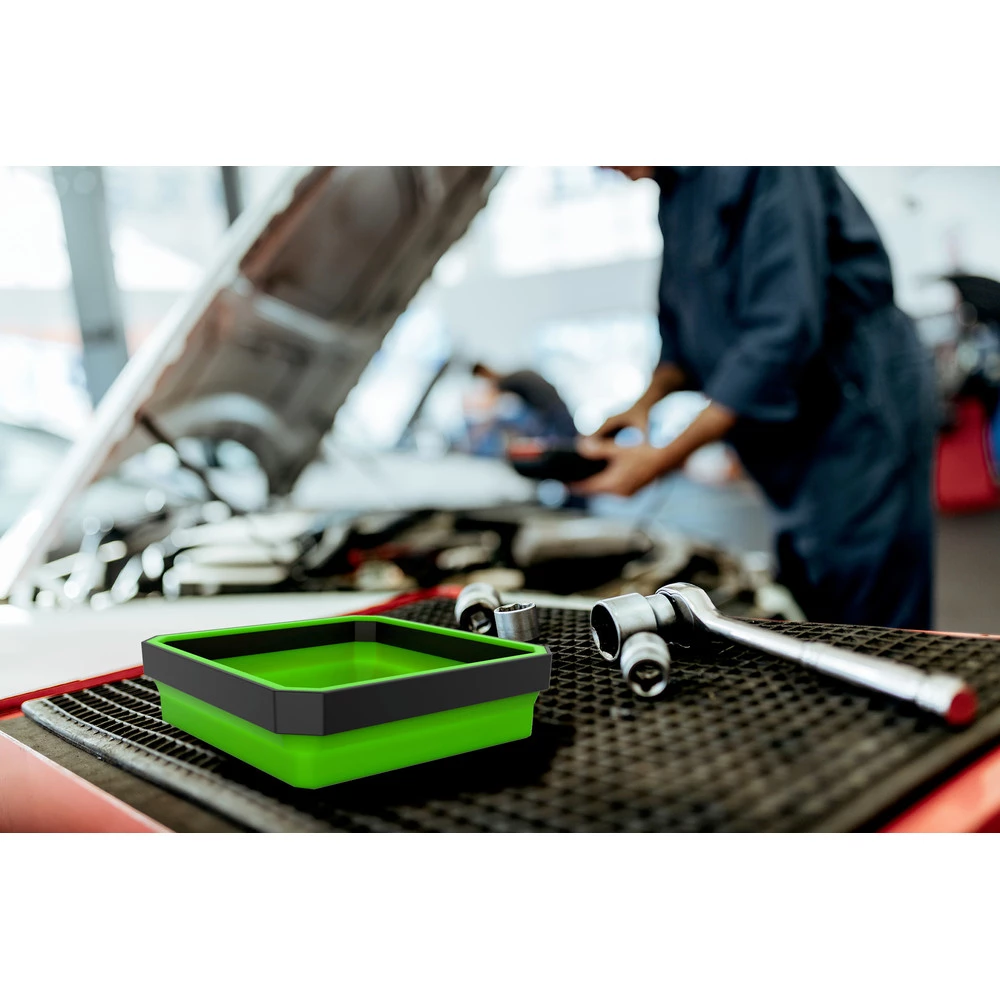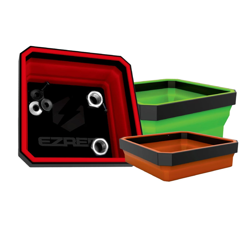 Introducing EZRED’s new collapsible magnetic parts organizer, the EZTRAY. This innovative organizer is made from a durable silica material that is pliable up to 5X its origin. The non–marring 4 in. x 4 in. magnetic base with five strong, embedded magnets holds the EZTRAY to most metal surfaces, while securing the metal parts inside. The EZTRAY’s compact profile stores conveniently when not in use and quickly expands from 3/4 in. to 2 in. high when needed. EZTRAY stands up to the harshest environments, as it is resistant to most automotive fluids, yet is easy to rinse and clean.