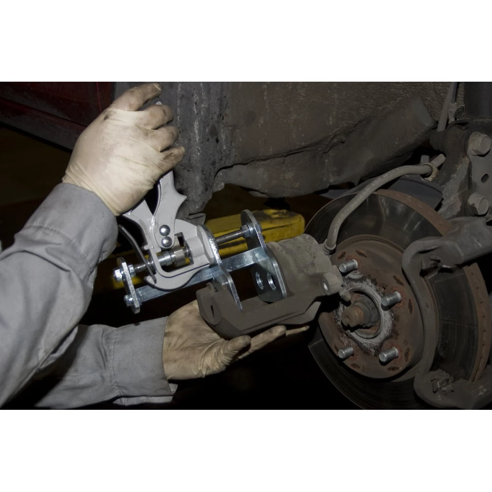 A quick way to spread brake pads and compress disc brake pistons for pad replacement on single, double and quad piston calipers, this unit simultaneously compress all four pistons on quad piston applications.
