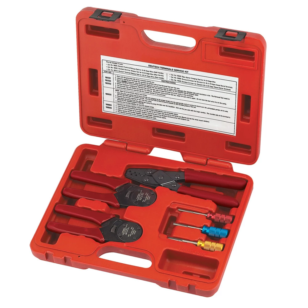 The 18650 Deutsch Terminals Service Kit is a complete six-piece kit to crimp and release the Deutsch terminals found throughout the industry on trucks, construction equipment, motorcycles, race cars, agricultural and marine equipment, heavy duty vehicles and other vehicles and equipment subject to excessive vibration and wherever an environmentally sealed connection is used.